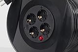 Bei der as – Schwabe Aktions Profi-Kabeltrommel besteht der Trommelkörper wie bei den meisten Kabeltrommeln für den Innenbereich aus hochbruchfestem Spezial-Kunststoff. Das Tragegestell ist aus verzinktem Stahrohr gefertigt. Insgesamt macht die Verarbeitung einen für die Preisklasse guten Eindruck und die Kabeltrommel wirkt stabil und standsicher. Das Kabel ist in 4 verschiedenen Längen zwischen 20 und 50 Metern lieferbar. Das Material ist vom Typ Typ H05VV-F 3G1,5 und wirkt etwas steif. Das Auf- und Abrollen erweist sich als etwas schwergägiger als bei anderen Kabeltrommeln, das ist evtl. auch auf das verwendete Kabel zurückzuführen. Auch dieser Kabeltrommel hat as – Schwabe eine Feststellbremse spendiert um ungewolltes Auf- und Abrollen zu verhindern. Dies erweist sich im alltäglichen Gebrauch und bei der Lagerung sehr nützlich. So lässt sich auch der fehlende Befestigungs-Clip am Kabelende verschmerzen. Die 4 verfügbaren Steckdosen erweisen sich beim Anstecken von Geräten als etwas schwergängig, es bleibt zu hoffen, dass mit längerer Einsatzdauer sich der Vorgang etwas Leichgängiger gestaltet. Beim Thema Sicherheit muss man keine Abstriche hinnehmen, die Kabeltrommel erfüllt die Schutzklasse IP20 gegen das Eindringen von Fingern und Gegenständen bis 12,5 mm Durchmesser. Auch verschiedene VDE-Bestimmungen werden eingehalten: DIN EN 61242, DIN VDE 0620-1, DIN VDE0282-4 und DIN VDE 0281-5. Sollte einmal die maximale Leistungsentnahme von 3.500 Watt überschritten werden, schützt ein Thermoschalter die Kabeltrommel vor Überhitzung. Das Gütesiegel „Made in Germany“ rundet den Gesamteindruck noch positiv ab und hinterläßt einen guten Eindruck.